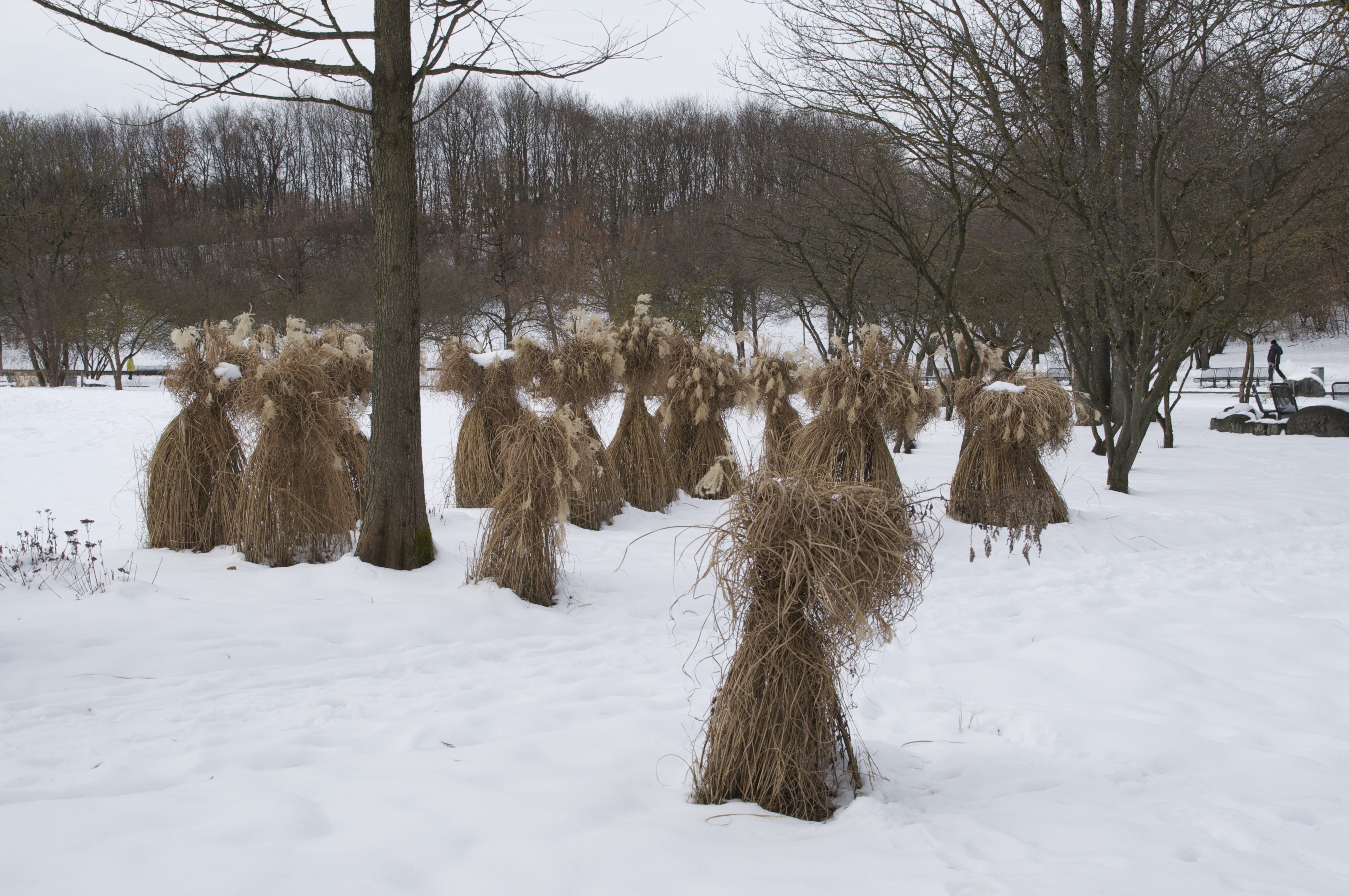Die zusammengebunden Gräser haben mich immer wieder an Hunde erinnert (z.B. Pudel) . Das war die einzige Stelle im Westpark wo so viele „Hunde“ sich im Schnee versammelten.